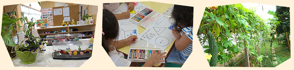 ① 延長保育 残業、緊急、一時的な理由により、保育時間が延長になった場合、弾力的に対応します。《18:00~19:00 月契約¥2,500円 1時間¥300(18:00以前¥200)》 ② 発達支援保育 支援を必要とする児童を受け入れ統合保育の中で共に育ちあう喜びを提供します。③ 英語・リトミック・体育あそび 専門講師による指導です。遊びを通じて外国語や文化に親しみます。 |